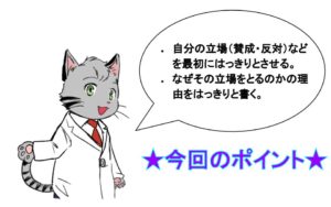 - 自分の立場(賛成・反対)などを最初にはっきりとさせる。
